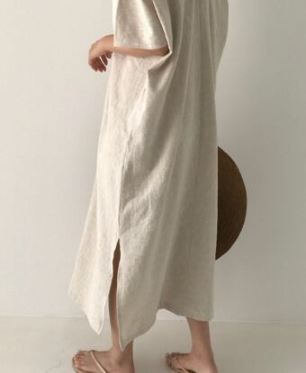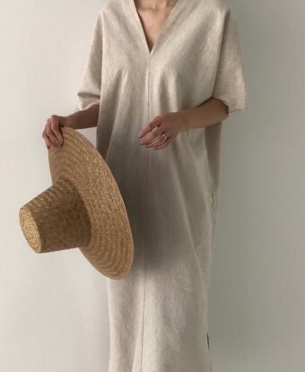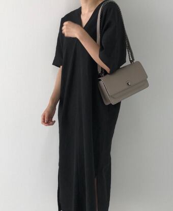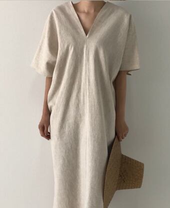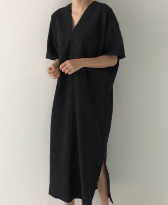 オシャレな女性に人気のVネックロングワンピース。ゆったりとしたデザインなので、リラックスして着こなせます。五分袖と半袖の2種類から選べるので季節やシーンに合わせて着用可能です。