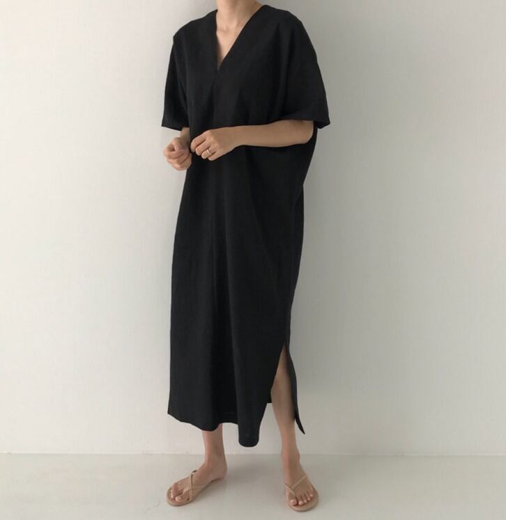 ワンピース ロングスカート レディース Vネック 五分袖 半袖 フレア シンプル ゆったり オーバーサイズ サイドスリット 無地 夏 デイリー カジュアル リゾート ワンサイズ 黒 ベージュ 20代 30代 OL 通勤 デート お出かけ 女子会 パーティー イベント 韓国系 コーデ モテ 美脚 脚長 インスタ映え プチプラ オフィス クール リゾートカジュアル 大人 カジュアル かっこいい ゆる ラクチン インスタ インポート海外 人気 旅行 楽ゆっくりママOL お得 送料無料 ファッションインポート