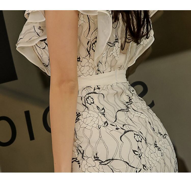 このワンピースは、膝上丈のタイトスカートと透け感のある半袖トップスが一体になったエレガントなデザインです。白やベージュを基調とした上品なカラーと、フェミニンなレースとフリルにウエストマークがセクシーで可愛らしい雰囲気を醸し出しています。シースルーで肌見せをして、大人の色香を漂わせてください。