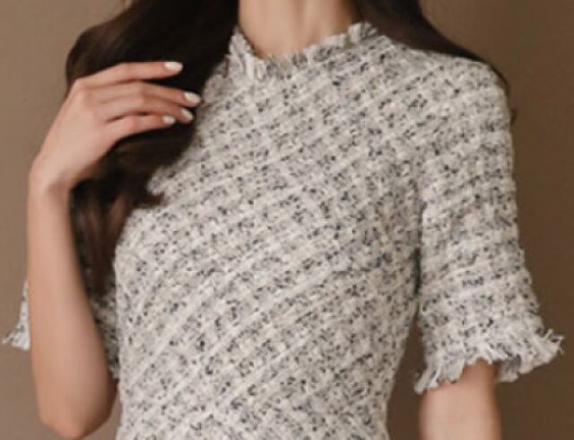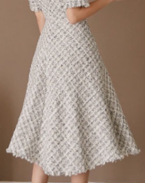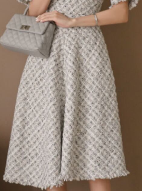 フレアシルエットが女性らしさを引き立てる、大人可愛いフレアワンピース。ミディアム丈でオフィススタイルはもちろん、お呼ばれやデイリーにもぴったりです。ツイード調の素材感が高級感を演出し、Aラインシルエットで脚長効果も◎。