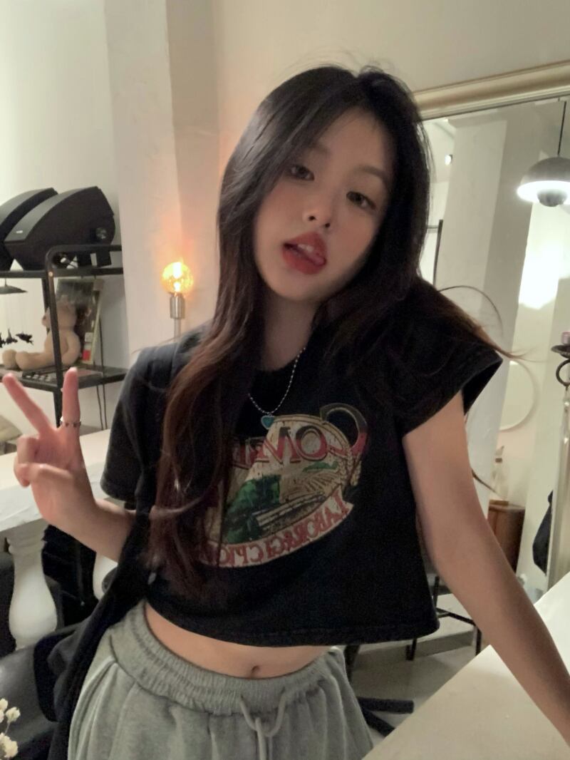ジーパンに合わせて、流行のへそ出しコーデで。