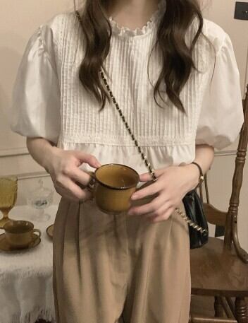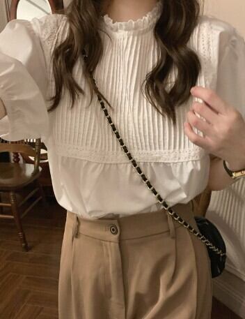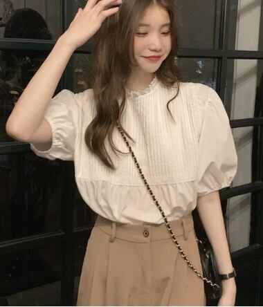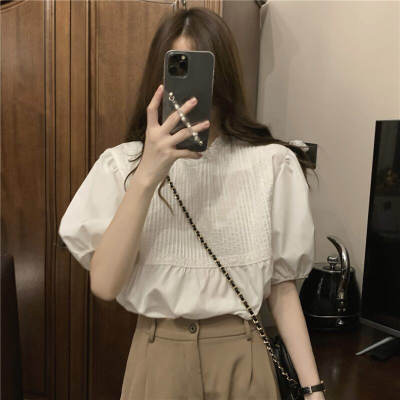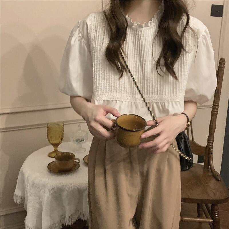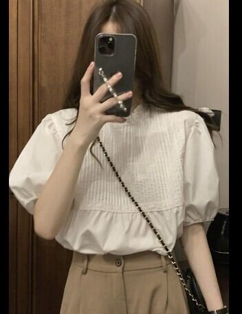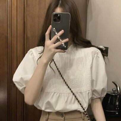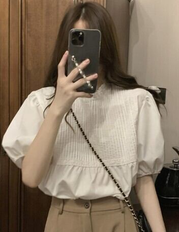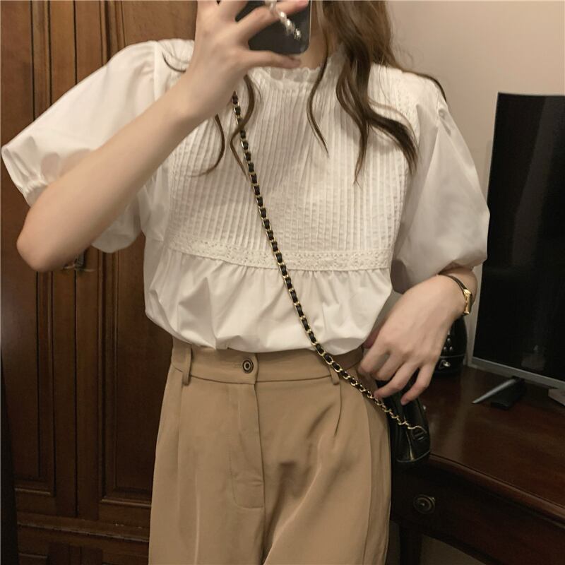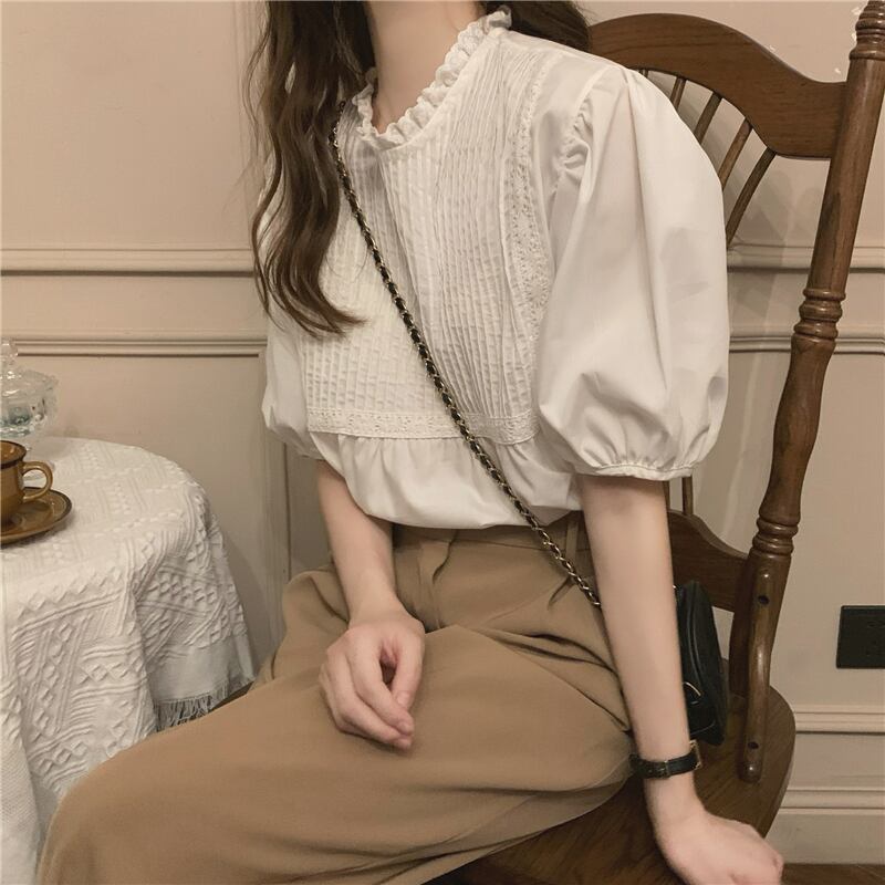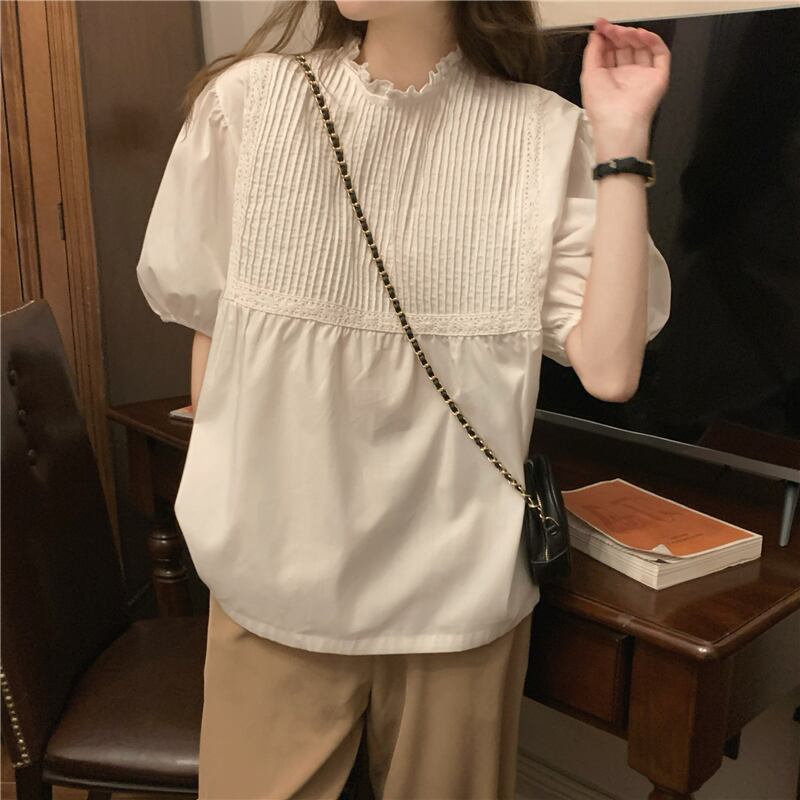 レディース ファッション 個性的 半袖 パフスリーブ ブラウス トップス 白トップス ミディアム丈 袖あり ボリューム袖 襟付き スタンドカラー レース フリル かわいい 大人可愛い シンプル カジュアル 大人 上品 おしゃれ お洒落 大人女子 無地 春 夏 10代 20代 通勤 学生 通学 デート お出かけ 女子会 休日 旅行 着回し 普段使い 重ね着 韓国 韓国系 オルチャン ゆったり フリーサイズ 色展開 白 ホワイト 安いお得 合わせやすい 低価格 コスパ 値段重視 低予算 インポート 簡単