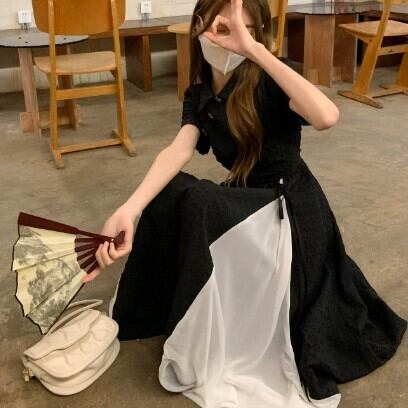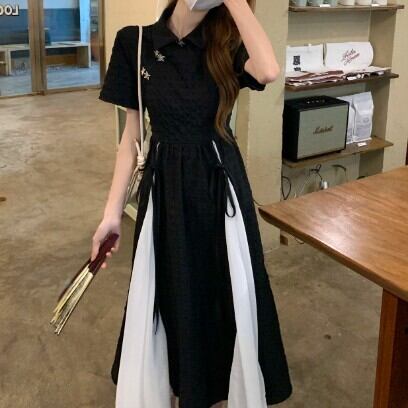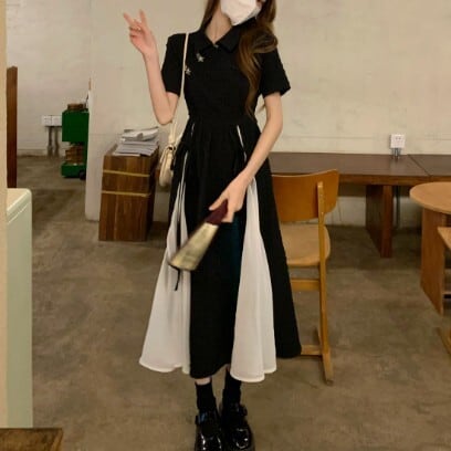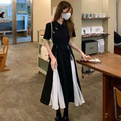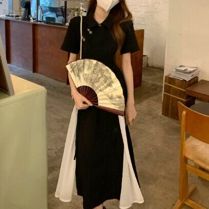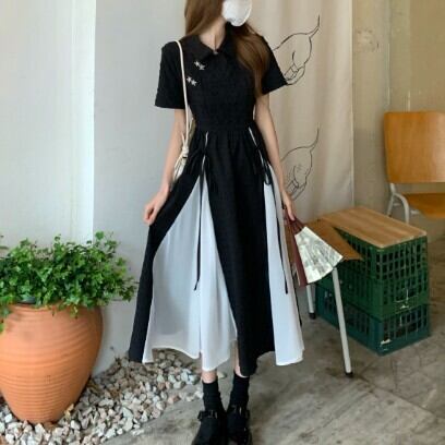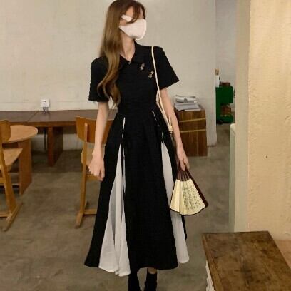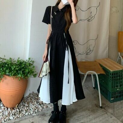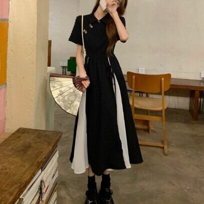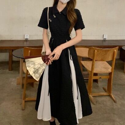 レディース ファッション 個性的 チャイナ風 半袖 ミモレ丈 ワンピース 膝下 ミモレ 袖あり 襟付き Aライン 切り替えデザイン リボン ハイウエスト かわいい 大人可愛い カジュアル 大人 おしゃれ お洒落 大人女子 主役級 無地 夏 10代 20代 通勤 学生 通学 デート お出かけ 女子会 休日 旅行 着回し 普段使い 重ね着 韓国 韓国系 オルチャン モノトーン バイカラー サイズ S M L 黒 ブラック 安いお得 合わせやすい 低価格 コスパ 値段重視 低予算 インポート 簡単 ギフト 海外