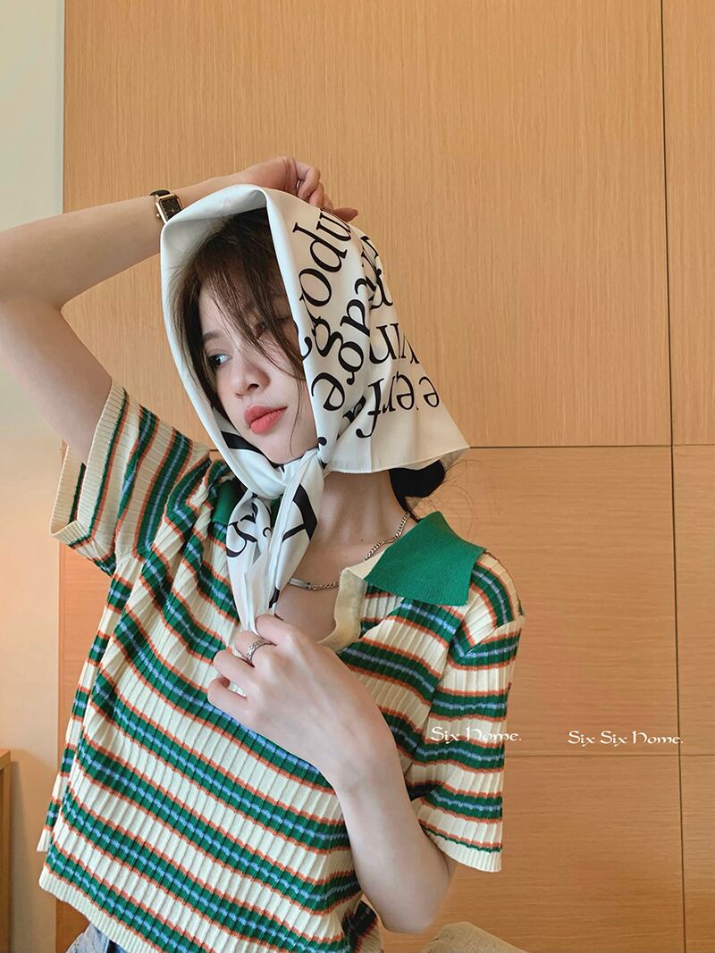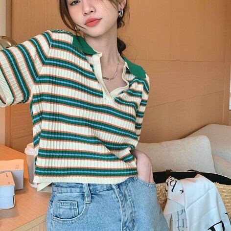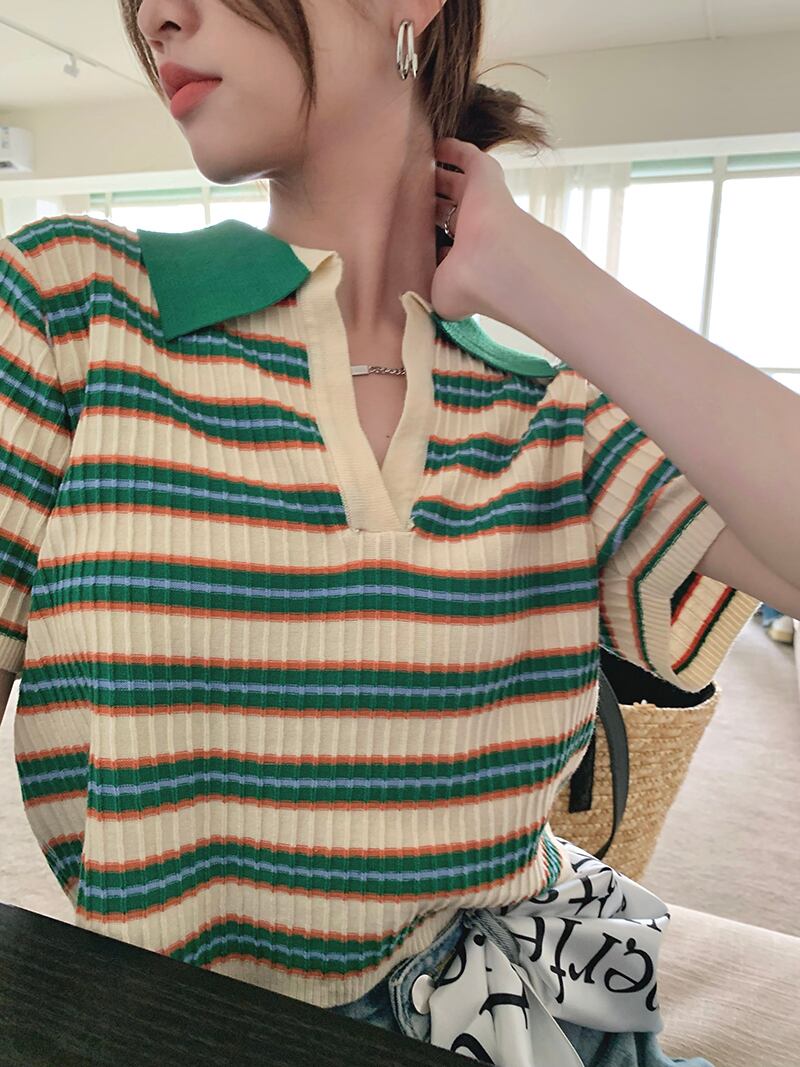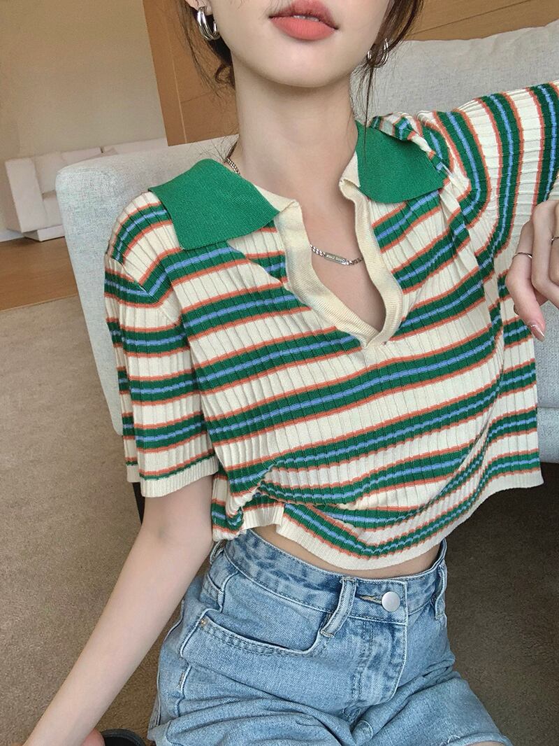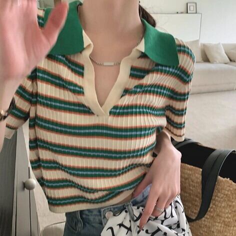レディース ファッション 個性的 ストライプ柄 ショート丈 ポロ襟 サマーニット トップス ニットソー セーター ショート 袖あり 半袖 Vネック 襟付き リブ リブニット ニット かわいい 大人可愛い カジュアル 大人 おしゃれ お洒落 大人女子 こなれ感 ルーズ 存在感 柄 ボーダー シマ 春 夏 10代 20代 通勤 学生 通学 デート お出かけ 女子会 休日 旅行 着回し 普段使い 重ね着 韓国 韓国系 オルチャン ゆったり ゆる フリーサイズ 緑 グリーン 安いお得 合わせやすい 低価格 コスパ