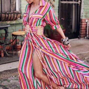 キュートなストライプ柄の、ロング・シャツワンピース。存在感のある大人女子に最適。