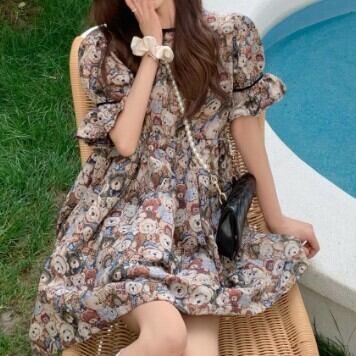 レディース ファッション 個性的 くま柄 ミニ丈 半袖 フレアワンピース ワンピース ミニ 膝上 袖あり パフスリーブ フレアスリーブ ラウンドネック 襟なし フレア スリム 細身 切り替えデザイン ハイウエスト かわいい カジュアル おしゃれ お洒落 レトロ ラブリー キュート ガーリー 主役級 存在感 柄 アニマル柄 夏 10代 20代 通勤 学生 通学 デート お出かけ 女子会 休日 旅行 着回し 普段使い 韓国 韓国系 オルチャン コーデ 楽ちん フリーサイズ クマ柄 安いお得 合わせやすい