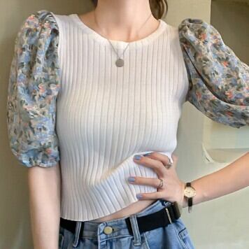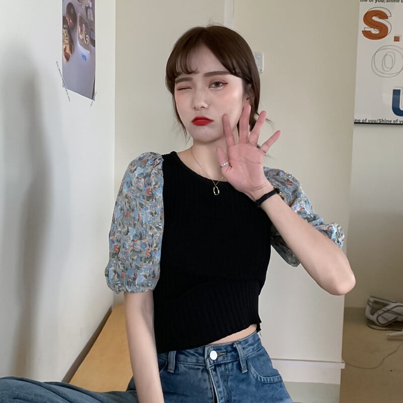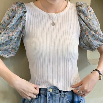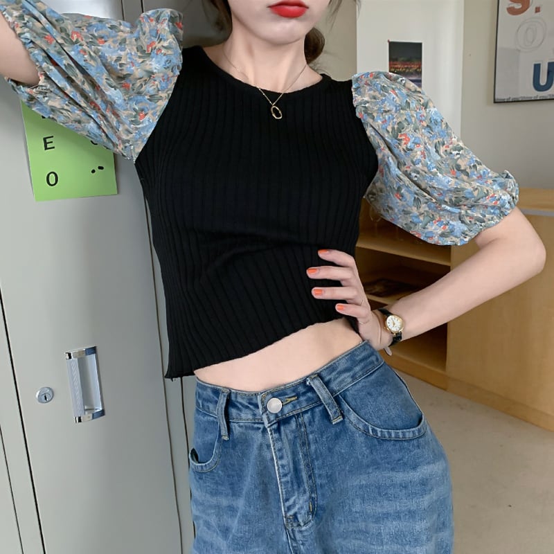 レディース ファッション 個性的 カラバリ 異素材MIX ニット ブラウス トップス ニットソー セーター ショート ショート丈 袖あり 半袖 パフスリーブ ラウンドネック スリム 細身 リブ リブニット サマーニット かわいい 大人可愛い カジュアル 大人 おしゃれ お洒落 大人女子 主役級 存在感 柄 花柄 小花柄 フラワー 夏 10代 20代 通勤 学生 通学 デート お出かけ 女子会 休日 旅行 着回し 普段使い 韓国 韓国系 フリーサイズ 白 ホワイト 黒 ブラック 青 ブルー 紫 パープル