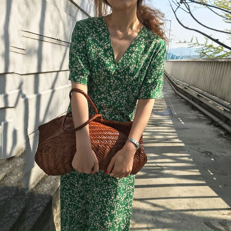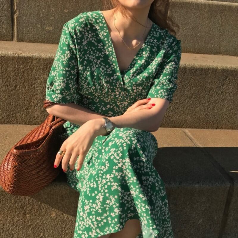 レディース ファッション 個性的 小花柄 半袖 Vネック カシュクール ワンピース 膝下 ミモレ ミモレ丈 袖あり 襟なし スリム 細身 Aライン 切り替えデザイン ハイウエスト かわいい 大人可愛い カジュアル 大人 おしゃれ お洒落 大人女子 主役級 柄 花柄 フラワー 春 夏 10代 20代 30代 通勤 学生 通学 デート お出かけ 女子会 休日 旅行 着回し 普段使い 重ね着 韓国 韓国系 オルチャン 楽ちん フリーサイズ 緑 グリーン 低価格 コスパ 値段重視 低予算 インポート 簡単