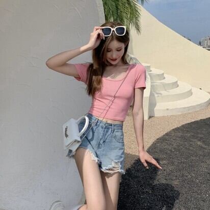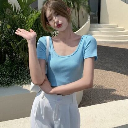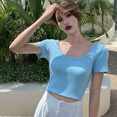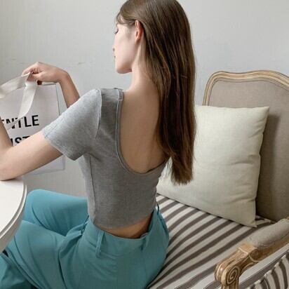 レディース ファッション 個性的 カラバリ 背中開き ショート丈 半袖 Tシャツ トップス カットソー ショート 袖あり Uネック 襟なし スリム タイト 細身 伸縮性 綿 かわいい 大人可愛い きれいめ シンプル カジュアル 大人 おしゃれ お洒落 大人女子 個性的 無地 春 夏 10代 20代 通勤 学生 通学 デート お出かけ 女子会 休日 旅行 着回し 普段使い 重ね着 韓国 韓国系 オルチャン フリーサイズ 色展開 白 ホワイト 黒 ブラック 青 灰色 グレー ピンク ライトブルー 水色 低価格