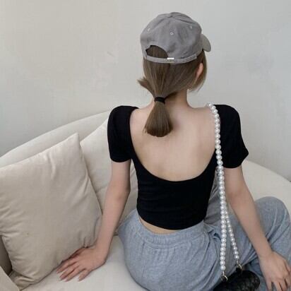 個性的で可愛いデザインが魅力のショート丈Tシャツ。Uネックで程よい肌見せができ、背中の開いたデザインで抜け感もプラス。襟や袖がないので、スッキリとした印象を与えます。細身で伸縮性のある綿素材で、着心地も抜群です。カジュアルなデニムパンツにも、きれいめなワイドパンツにも合わせやすく、幅広いシチュエーションで活躍してくれます。