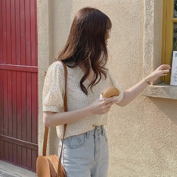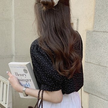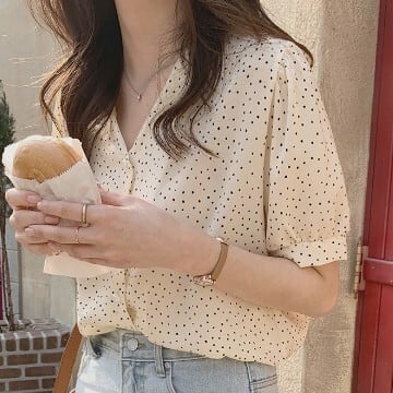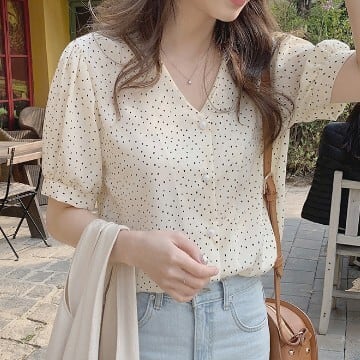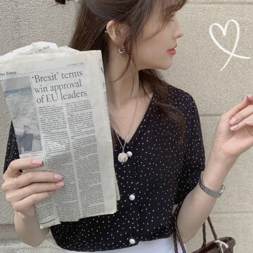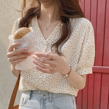 レディース ファッション 個性的 パール ボタン ドット柄 シフォンブラウス トップス シャツ ブラウス ショート ショート丈 袖あり 半袖 Vネック 襟なし シフォン 薄手 かわいい 大人可愛い シンプル カジュアル 大人 おしゃれ お洒落 大人女子 こなれ感 ラブリー キュート ガーリー 主役級 水玉 夏 10代 20代 通勤 学生 通学 デート お出かけ 女子会 休日 旅行 着回し 普段使い 重ね着 韓国 韓国系 オルチャン サイズ S M L 色展開 黒 ブラック 低価格 コスパ 値段重視 低予算