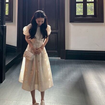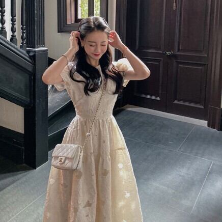 全体的にフレアシルエットになっており、Vネックデザインのパフスリーブで、上品かつキュートな印象を与えます。ミモレ丈の着丈感も◎で、カジュアルにもきれいめにも使えるので、幅広いシーンで活躍してくれます。