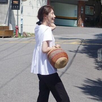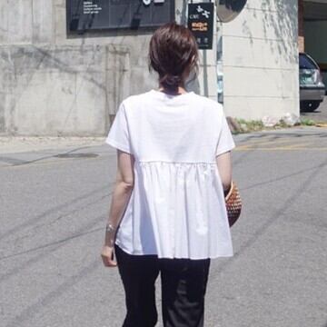 大人可愛い半袖Tシャツ、バック切り替えデザインがポイントです。ふわりと広がるフレアシルエットで、女性らしさも演出。バックシャンなので、後ろ姿もおしゃれに見えます。