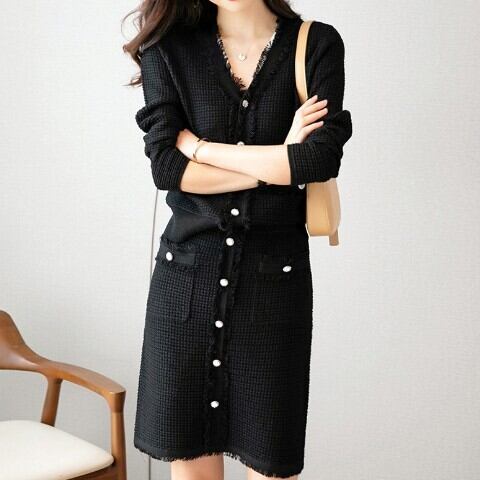 このニットセットアップは、大人の女性にぴったりのきれいめなファッションアイテムです。