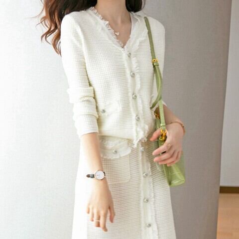 トップス、スカート、カーディガンの3点セット。無地でシンプルなデザインは、大人可愛く着こなせる。Vネックが女性らしさを引き出す。