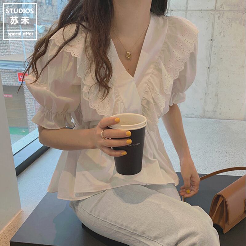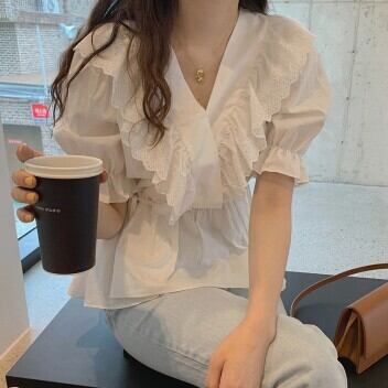 レディース ファッション 個性的 フリルブラウス トップス ブラウス 袖あり 半袖 パフスリーブ Vネック ペプラム レース フリル ウエストマーク かわいい 大人可愛い きれいめ シンプル 大人 上品 おしゃれ お洒落 大人可愛い 大人女子 ラブリー キュート ガーリー 無地 春 夏 10代 20代 30代 学生 通学 デート お出かけ 女子会 休日 着回し 普段使い 韓国 韓国系 オルチャン サイズ S M L XL 色展開 白 ホワイト 女の子プレゼント 安いお得 合わせやすい 低価格