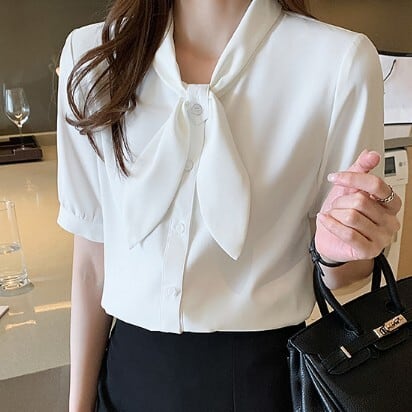 トップス リボン シャツ ブラウス リボン結び レディース ファッション 個性的 襟付き フロントボタン 半袖 袖あり 無地 シンプル パフ袖 パフスリーブ シフォン スイート 大人可愛い かわいい 可愛い ラブリー 通勤 通学 学生 おでかけ デート 旅行 休日 普段着 普段使い 着回し 10代 20代 大きいサイズ S M L XL 2XL ホワイト 女の子プレゼント 安いお得 合わせやすい 低価格 コスパ 値段重視 低予算 インポート 簡単 ギフト 海外 イメチェン 好感度 イメージアップ 外国