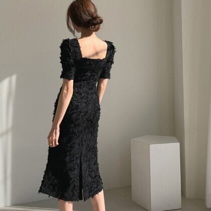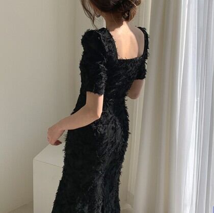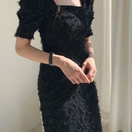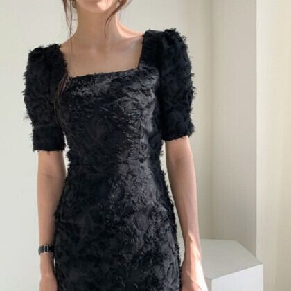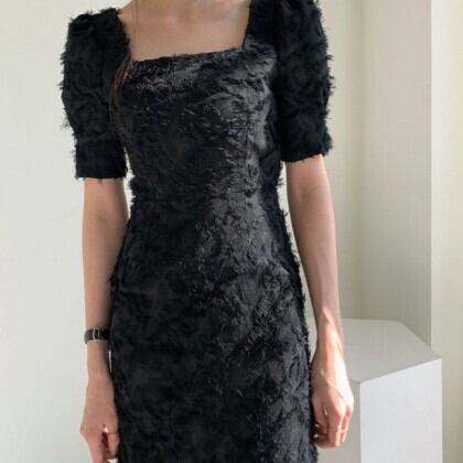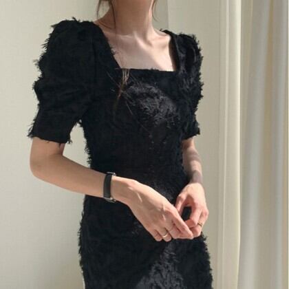 大胆で個性的なデザインが魅力のスクエアネック半袖ワンピース。パフスリーブや立体的な起毛加工が施されたシャギータイプで、背中には魅せるバックスリットを配しています。