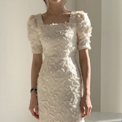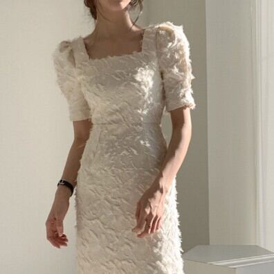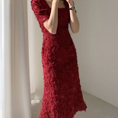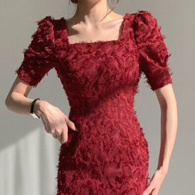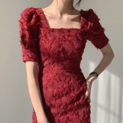 ワンピース ドレス スクエアネック 半袖 袖あり レディース ファッション 個性的 パフ袖 パフスリーブ シャギー 立体 起毛 タイト スリム 細身 シンプル 無地 ミディ丈 ロング 膝下 ひざ下 バックスリット 背中魅せ 背中開き 大人可愛い かわいい 可愛い おしゃれ お洒落 大人 上品 大人女子 通勤 通学 お出かけ デート 旅行 休日 普段使い パーティー イベント 10代 20代 S M レッド 赤 アプリコット 女の子プレゼント 安いお得 合わせやすい 低価格 コスパ 値段重視 低予算