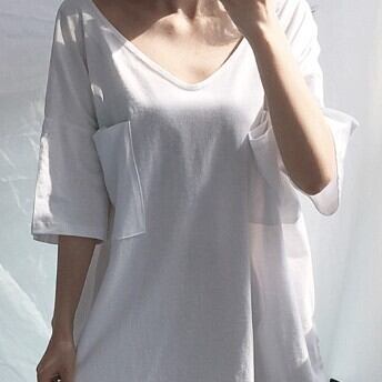 このTシャツは、ネックラインがV字になっていて、女性らしいデザインです。コットン素材で着心地も良く、ルーズでラブリーな仕上がりになっています。女性らしさを強調したい方や、個性的なファッションを楽しみたい方にぴったりです。