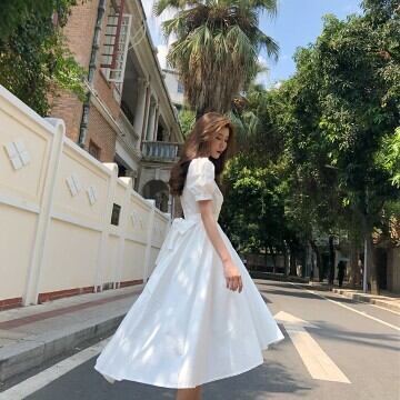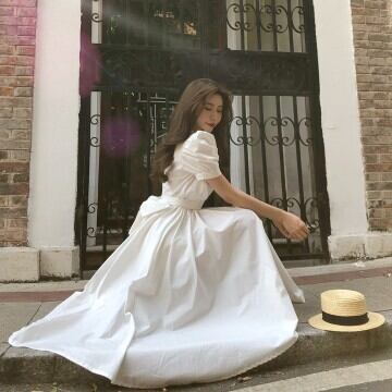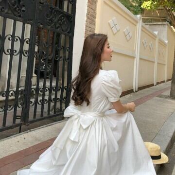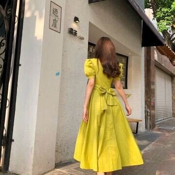 バックリボンが可愛らしい、個性的なフィッシュテールワンピースです。プリーツが施されたフレアなシルエットで上品かつフェミニンな印象を与えます。袖ありのデザインは、肩や二の腕をカバーし、女性らしいシルエットを作り出します。ホワイト、グリーン、黄緑の3色をご用意しており、それぞれの色味も絶妙で、夏らしい爽やかな印象を与えます。