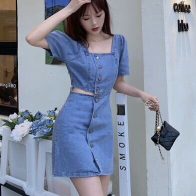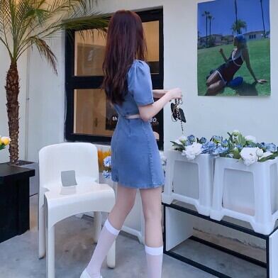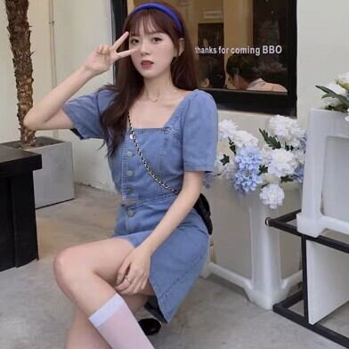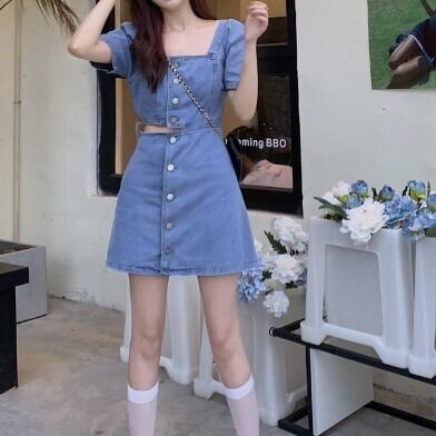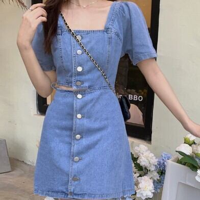 半袖ワンピース デニム へそ出し チラ見せ レディース ファッション 個性的 スクエアネック ミニ ショート丈 スカート クール カッコイイ キュート プリティ タイト ボタン シンプル 大人 スタイルアップ ウエストマーク お姉さん 着痩せ 着回し 脚長 M L 大きいサイズ おしゃれ 春 夏 ブルー 青 大人可愛い 普段使い デイリー使い 休日 お出かけ デート 女子会 存在感 主役級 こなれ感 韓国 海外トレンド インス映え 大人気 流行 10代 20代 30代 40代 おすすめ コーデ 洋服