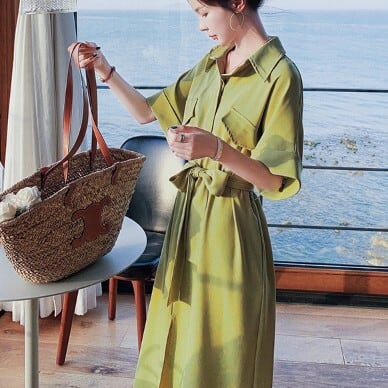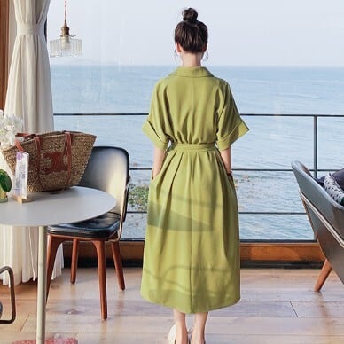グリーンのピスタチオカラーがおしゃれな、半袖シャツワンピースです。ロング丈でミモレ丈になっており、ウエストのベルトでシルエットを綺麗に見せることができます。ドロップショルダーでリラックス感がありながら、ウエストマークによって女性らしい印象も持ちます。ポケットのディテールも可愛らしく、カジュアルにもエレガントにもお使いいただけます。