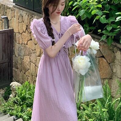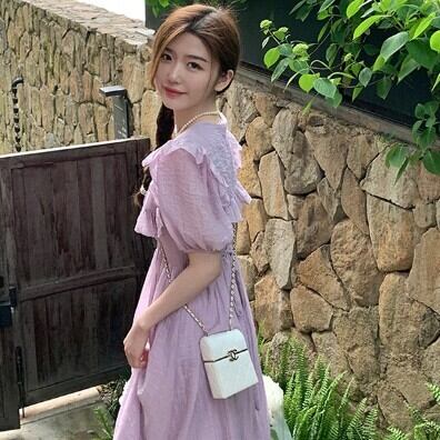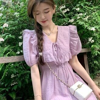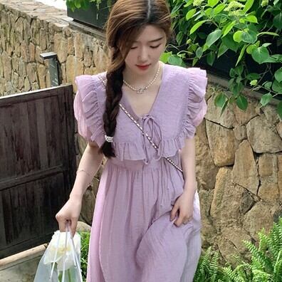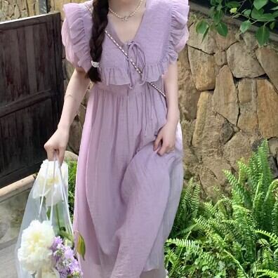半袖ワンピース レディース ファッション 個性的 フリル レトロ 清楚 シック ロング ウエストマーク ミモレ丈 ゆったり 上品 エレガント シンプル お姉さん カワイイ 着痩せ 着回し 脚長 S M L 大きいサイズ おしゃれ 夏 サマー パープル 紫 大人可愛い 普段使い デイリー使い 休日 お出かけ デート 女子会 存在感 主役級 こなれ感 韓国 海外トレンド インスタ映え 大人気 流行 10代 20代 30代 40代 おすすめ コーデ 洋服 似合う 着回し 無難 インポート 韓国スタイル