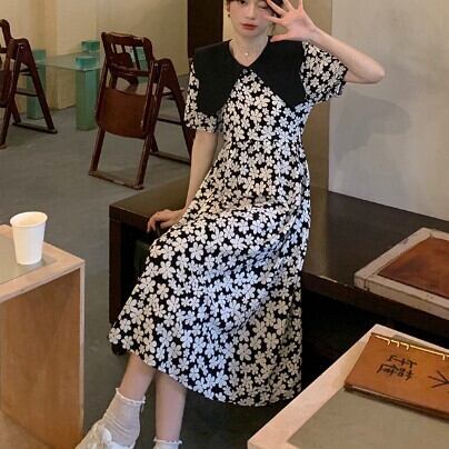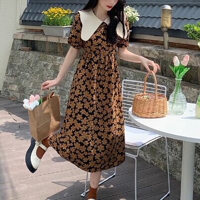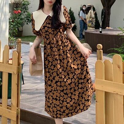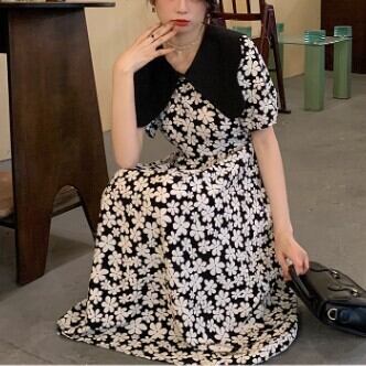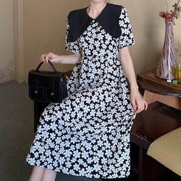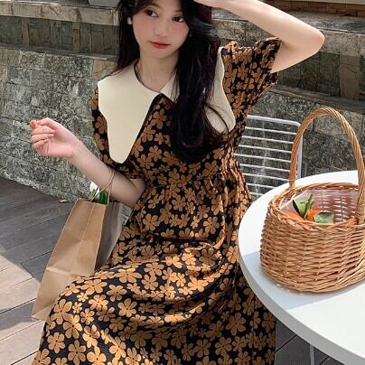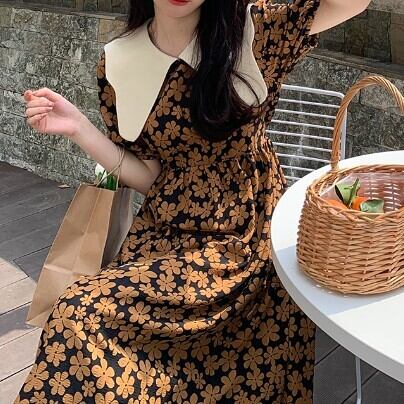 襟付きロングワンピース 花柄 フラワー Vネック フリル ラージカラー レディース ファッション 個性的 襟コンシャス ミモレ丈 半袖 ハイウエスト アプリコット系 上品 華やか 学生 ゆったり お姉さん カワイイ ガーリー キュート 着痩せ 着回し 脚長 おしゃれ 夏 サマー 大人可愛い 普段使い デイリー使い 休日 お出かけ デート 女子会 存在感 主役級 こなれ感 韓国ファッション 海外トレンド インスタ映え 大人気 流行 10代 20代 30代 40代 おすすめ コーデ 洋服 似合う 着回し