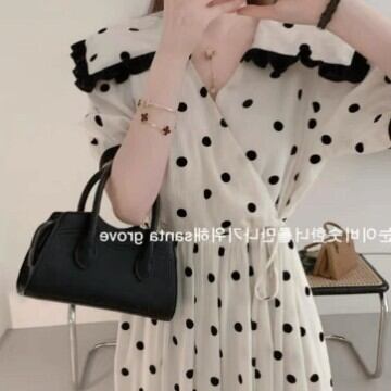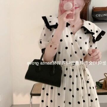 大人気のドット柄が可愛らしい半袖ワンピースが登場しました!程よいフレアとミモレ丈で女性らしいシルエットに、大きめの襟が上品で洗練された印象を与えます。ゆったりとしたフィットで着痩せ効果も抜群。おしゃれな大人女子にぴったりのデザインです。