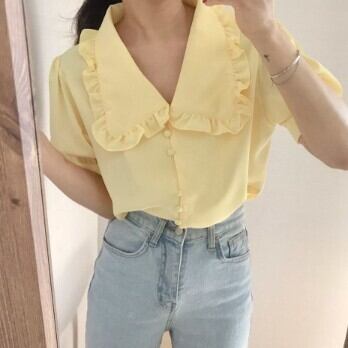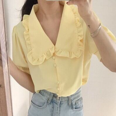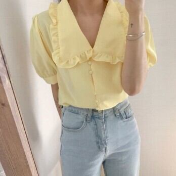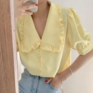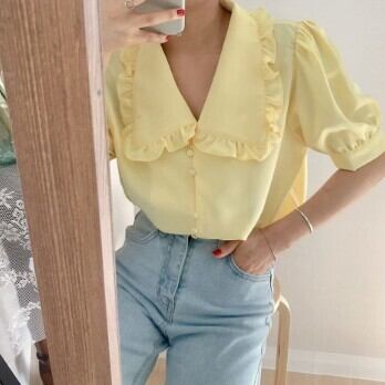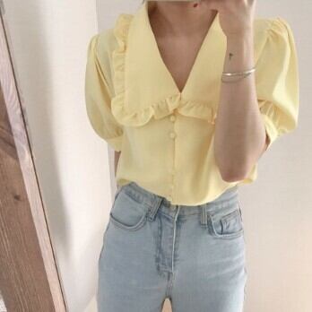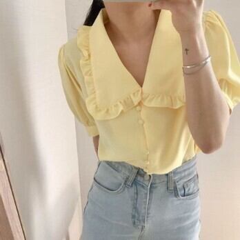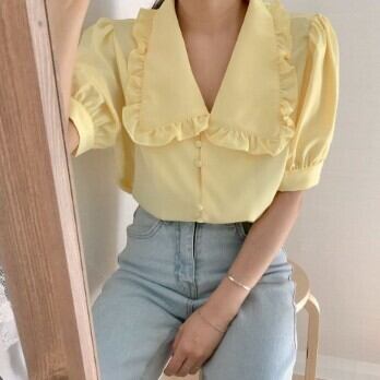 シャツ ブラウス プルオーバー 半袖 大きい襟 レディース ファッション 個性的 クール カッコイイ フリル ガーリー 上品 シック 無地 キュート 着回し ゆったり スタイリッシュ モテる 着痩せ トップス ワンサイズ フリーサイズ イエロー 黄色 おしゃれ デート 大人可愛い お出かけ 存在感 こなれ感 抜け感 普段使い デイリー使い 休日 主役級 インスタ映え 韓国 海外トレンド 大人気 高見え 流行 10代 20代 30代 40代 女の子プレゼント 安いお得 合わせやすい 低価格 コスパ 値段重視