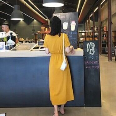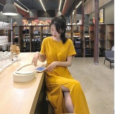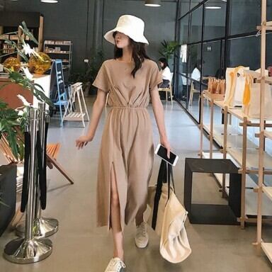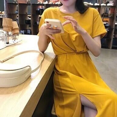 レディース ファッション 個性的 ロングワンピース クルーネック ミモレ丈 半袖 サイドスリット カジュアル ドローストリング ハイウエスト きれいめ モカ イエロー 上品 華やか ゆったり お姉さん カワイイ ガーリー キュート 着痩せ 着回し 脚長 おしゃれ 夏 サマー 大人可愛い 普段使い デイリー使い 休日 お出かけ デート 女子会 存在感 主役級 こなれ感 韓国 海外トレンド インスタ映え 大人気 流行 10代 20代 30代 40代 洋服 似合う 着回し 無難 インポート 韓国スタイル
