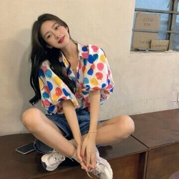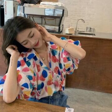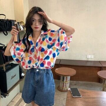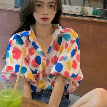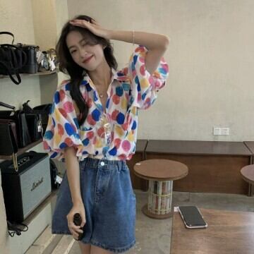 半袖 ブラウス シャツ レトロ プリント ドット柄 個性的 カラフル トップス レディース 夏 襟付き インパクト バルーン ポップ かわいい ラフ ゆったり 着回し 可愛い ホワイト 白トップス ワンサイズ フリーサイズ 春 夏 スプリング サマー おしゃれ デート 大人可愛い お出かけ 存在感 こなれ感 抜け感 女子会 普段使い デイリー使い 休日 主役級 インスタ映え 韓国ファッション 海外トレンド 大人気 高見え 流行 10代 20代 30代 女の子プレゼント 安いお得 合わせやすい 低価格