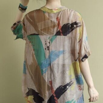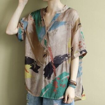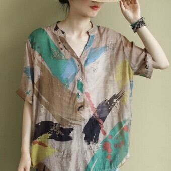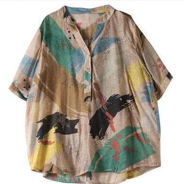 春 夏 ブラウス シャツ レトロ プリント ペイント風 コットンリネン 個性的 トップス 半袖 インパクト モード系 ラフ ゆったり 着回し カッコイイ カジュアル グラフィティ スタイリッシュ ユニーク 袖あり リラックス レディース ブラウン 茶色 M 大きいサイズ L XL 2XL 3XL 春 夏 お出かけ 存在感 こなれ感 抜け感 韓国ファッション 海外 旅行 ユニーク シャツ 楽ちん トップス カラフル 10代 20代 30代 40代 女の子プレゼント 安いお得 合わせやすい 低価格 コスパ