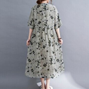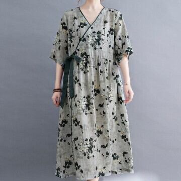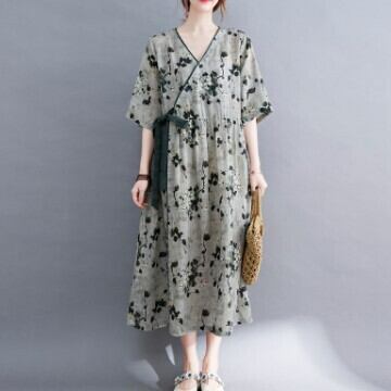 花柄 ロング ワンピース フレア 半袖 レディース Vネック ゆったり レトロ カジュアル 春 夏 ワンピ ミモレ丈 アジアン風 エスニック リボン 清涼感 カワイイ 脚長 着痩せ M 大きいサイズ L XL 2XL おしゃれ 春 夏 スプリング サマー グレー 灰色 大人可愛い モテコーデ デート 女子会 普段使い デイリー使い 休日 お出かけ 存在感 個性的 主役級 こなれ感 韓国ファッション 海外トレンド 大人気 高見え 流行 10代 20代 30代 女の子プレゼント 安いお得