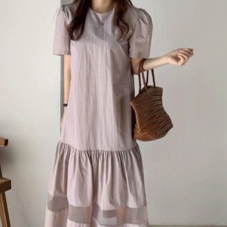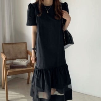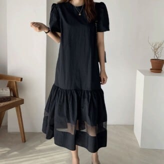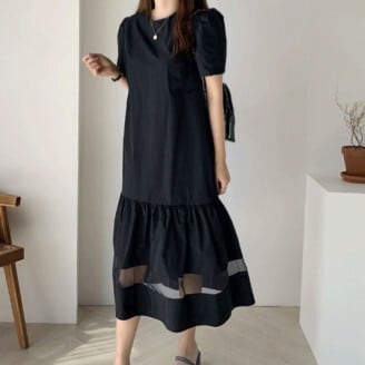 ワンピース レディース ロングワンピース ミモレ丈 フレアワンピース 裾フレア パフスリーブ ラウンドネック ギャザー ふんわり シースルー 透け感 シフォン レース おしゃれ 半袖 個性的 フェミニン エレガント 上品 きれいめ ゆったり 無地 襟なし 華やか 薄紫 紫 パープル 藤色 黒 ブラック 大人かわいい こなれ感 インスタ映え アイテム 韓国 ファッション 大人カジュアル コーデ デート お出かけ 主役級 10代 20代 春 夏 抜け感 オシャレ 楽ちん 女の子 プレゼント 安い お得