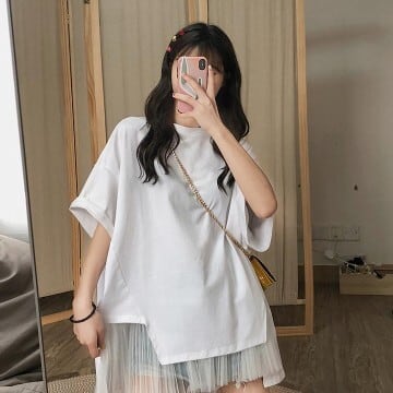 このデザインのTシャツは、着こなし次第で様々なスタイルに合わせられ、おしゃれ感をアップしてくれます。ロング丈なので、ワンピースのように着てもOK。また、大きいサイズ展開もあるので、プラスサイズの方にもおすすめです。襟なしでラウンドネックなので、首元のアクセサリーとの相性もバツグンです。