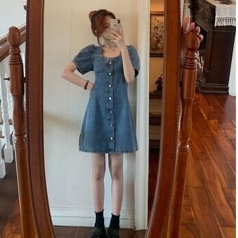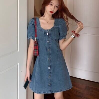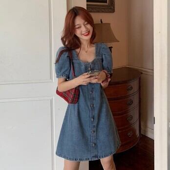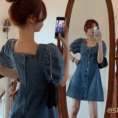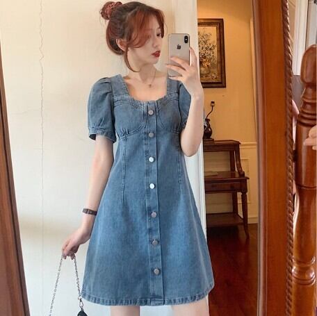 ワンピース レディース デニムワンピース デニムスカート ミニワンピ ミニスカート ミニ丈 パフスリーブ Aライン スクエアネック ハイウエスト おしゃれ 大人可愛い 袖あり 半袖 レトロ ガーリー 脚長 きれいめ ボタン 襟なし 青 デニム ブルー 水色 大人かわいい こなれ感 インスタ映え アイテム ファッション 個性的 くすみカラー 大人カジュアル コーデ デート 通学 学生 休日 女子会 主役級 10代 20代 春 夏トレンド 抜け感 オシャレ S M L 無地 タイト スリム 女の子 プレゼント