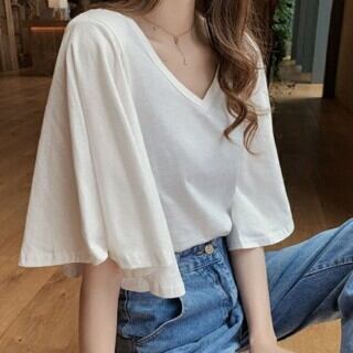 トップス デート シャツ ブラウス カットソー 袖あり 半袖 Vネック かわいい 女の子 プレゼント 個性的 大人可愛い きれいめ シンプル カジュアル 大人 上品 おしゃれ お洒落 主役級 存在感 無地 夏 10代 20代 レディース 女性用 OL 学生 デート お出かけ 公園デビュー 女子会 お泊まり 休日 旅行 着回し 普段使い ファッション コーデ 楽ちん トレンド 流行 インスタ映え L XL 2XL 3XL 4XL 大きい 大きめ ビッグサイズ ゆったり ゆる 白 ホワイト 黒 ブラック